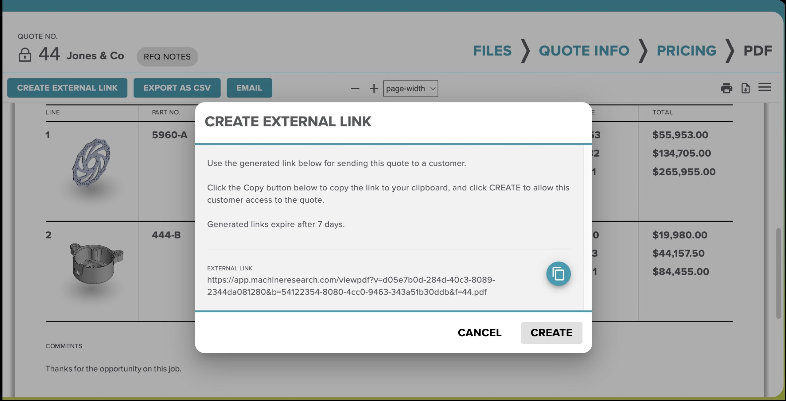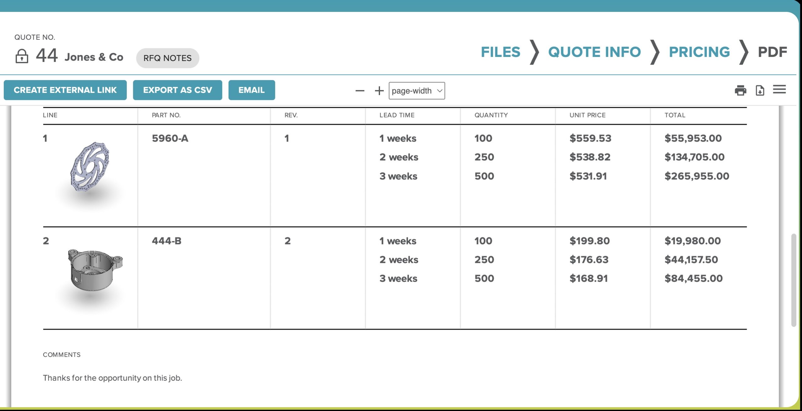 Quotes are clean, consistent, and built to impress. Thumbnails of the part build instant buyer confidence.